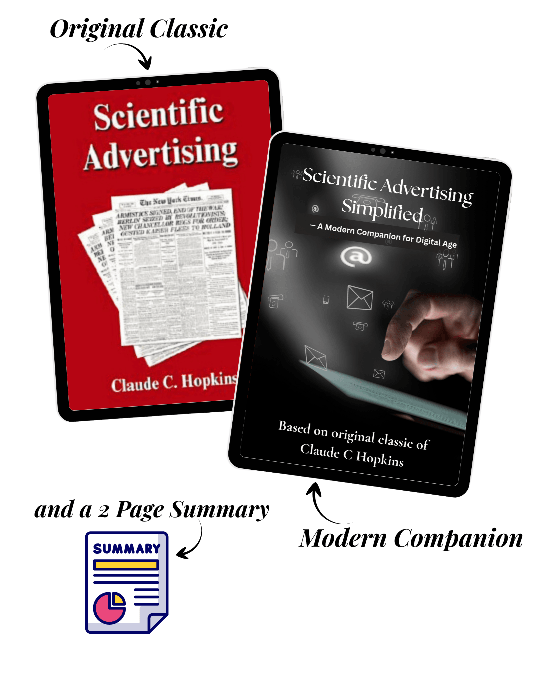 Plus you will be getting a 2 page summary of the entire book- You may call it distilled wisdom to its core. This 2-page summary gives you the essence of Claude Hopkins’ Scientific Advertising in plain, modern language—so you can grasp in minutes what many marketers spend years (and thousands of dollars) trying to figure out. It condenses Hopkins’ timeless principles into a quick, practical guide you can apply instantly to your ads, emails, and funnels—saving you time, eliminating guesswork, and giving you a proven foundation to build campaigns that actually sell.